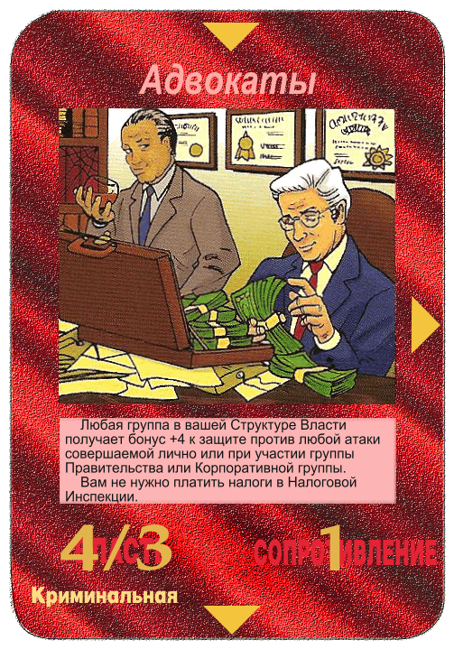 Любая группа в вашей Структуре Власти получает бонус +4 к защите против любой атаки совершаемой лично или при участии группы Правительства или Корпоративной группы.