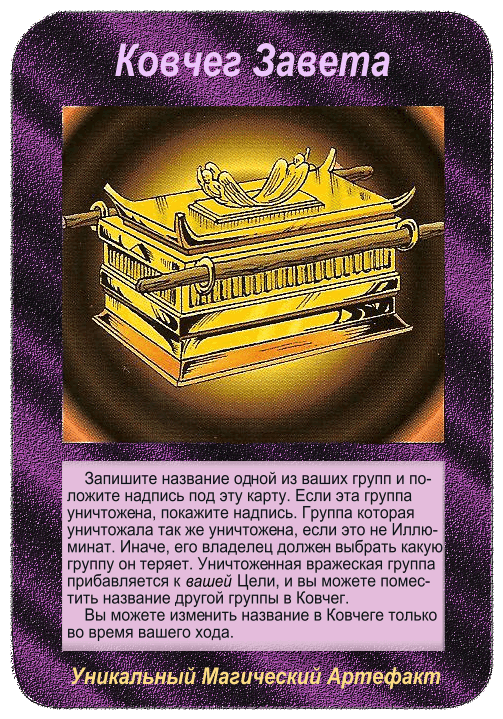 Этот артефакт одновременно и свящённый и проклятый, может использоваться так часто, как пожелаете! Он может дать+1 к любой Атаке на Уничтожение (любым игроком) или к любой Катастрофе.