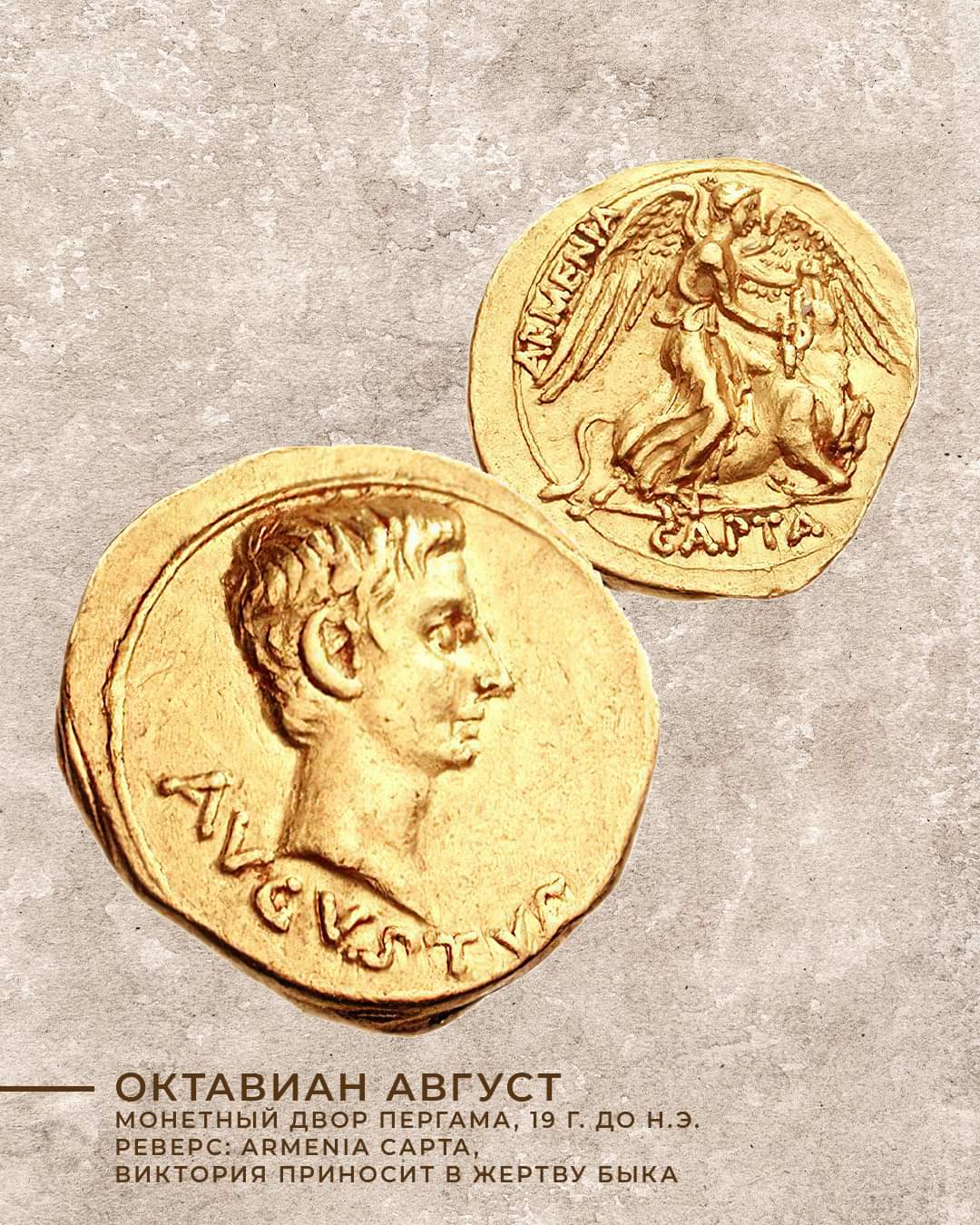 🪙 Римская золотая монета императора Августа, на которой богиня приносит в жертву быка (19 г. до н.э.).