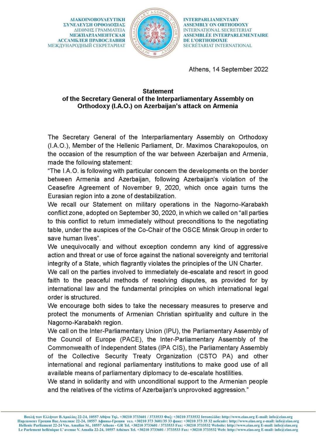 The European Parliament Report: "Strongly condemns the large-scale military aggression by #Azerbaijan in September 2022 against multiple places in the sovereign territory of #Armenia…"