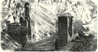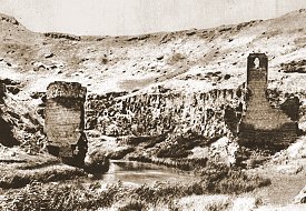 The bridge's single arch (which spanned over 30 metres) has fallen, leaving only tall abutments that were perhaps part of a fortified gate. Nineteenth century travellers reported a guardhouse next to the bridge, but this has now vanished. The drawing below is from the 1850s.