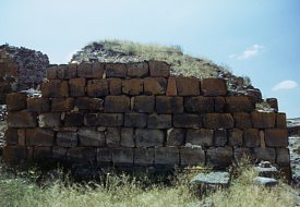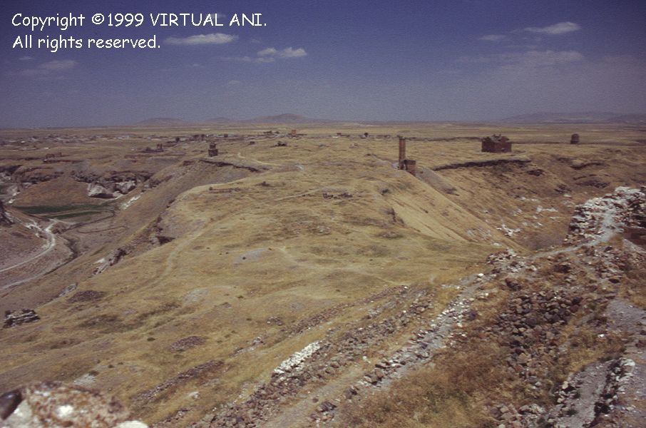 At the southern end of Ani the ground rises up to form a flat-topped hill. This part of Ani is known as the "Inner Fortress" (Midjnaberd in Armenian), or simply as the "citadel". As well as having natural defences of steep cliffs on three sides, the citadel was encircled by a single line of ramparts. This wall had towers on its north facing section, and an entrance gateway at its north-western corner.