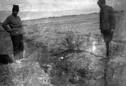 A group of people, among them Harutyun Hovakimyan, are digging from the earth the remains of Armenian victims, Der-Zor, 1938s