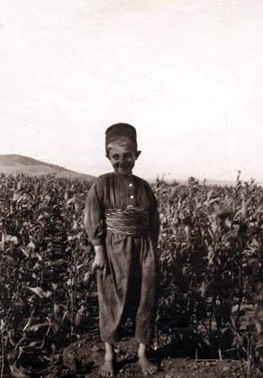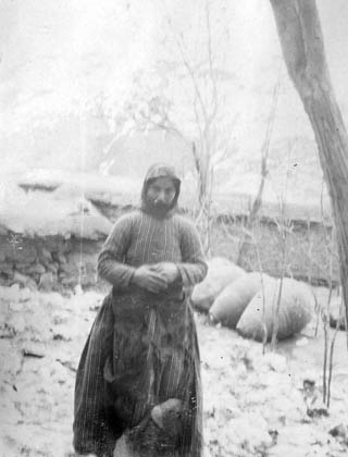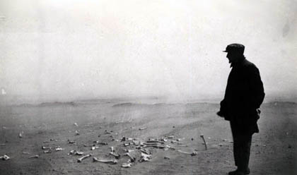 Armenian leader Papasian looking at the human remains of the terrible massacres at Der-el-Zor in 1915-1916.