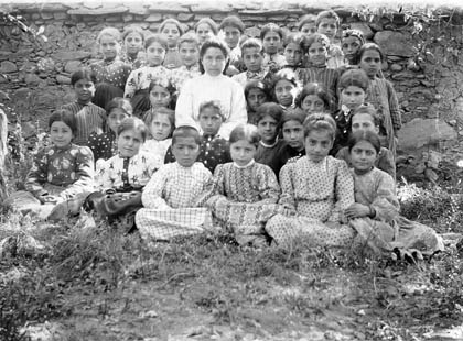 "One of the classes in the day-school in Mush with their teacher Margarid"