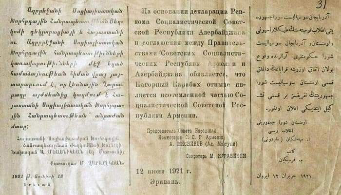 في عام 1921 ، اعترفت أذربيجان بأرتساخ باعتبارها جزءًا لا يتجزأ من أرمينيا ... آرتساخ هي أرمينيا وهذا كل شيء مع كل حجر، كل نصب تاريخي وكل شيء ... هذه الوثيقة حقيقة ...