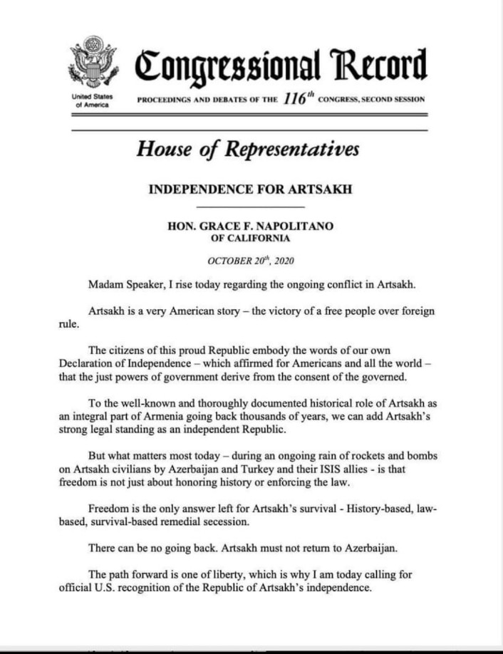 Կալիֆոռնիայից ներկայացուցիչ Գրեյս Ֆ. Նապոլիտանոն ելույթ է ունեցել Արցախում հակամարտության վերաբերյալ։