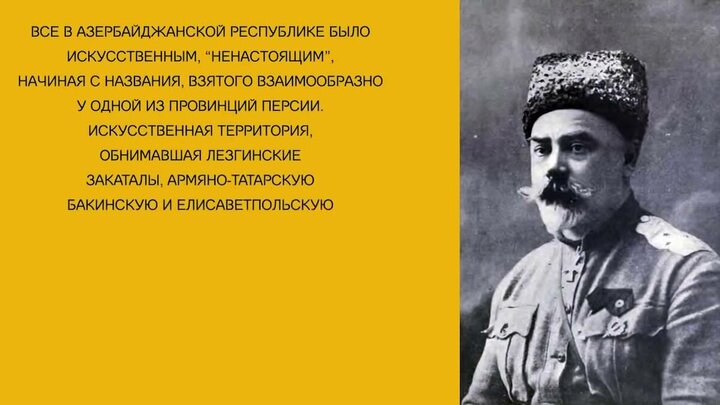 Воевавший против большевиков на южном фронте генерал Антон Деникин писал: «Все в Азербайджанской Республике было искусственным, «ненастоящим», начиная с названия, взятого взаимообразно у одной из провинций Персии. Искусственная территория, обнимавшая лезгинские Закаталы, армяно-татарскую Бакинскую и Елисаветпольскую губернии и русскую Мугань и объединенная турецкой политикой в качестве форпоста пантюркизма на Кавказе.