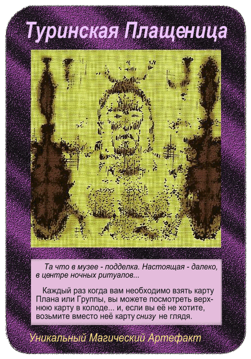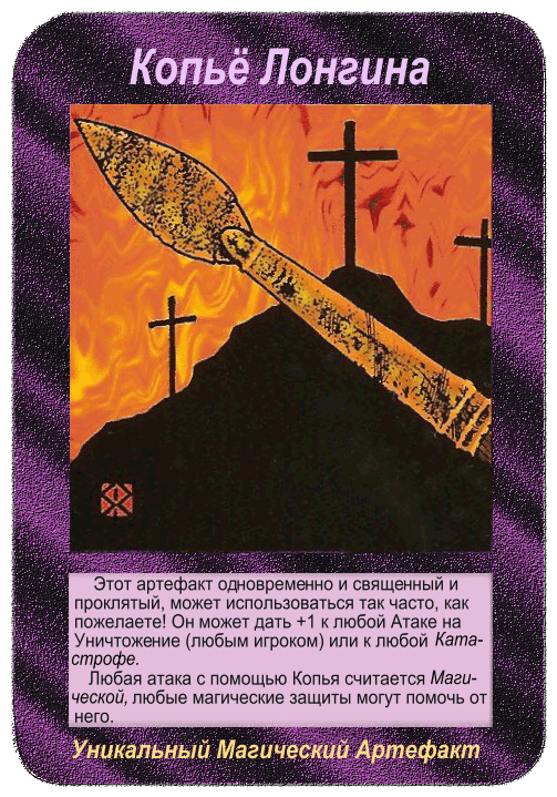 Этот артефакт одновременно и свящённый и проклятый, может использоваться так часто, как пожелаете! Он может дать+1 к любой Атаке на Уничтожение (любым игроком) или к любой Катастрофе.