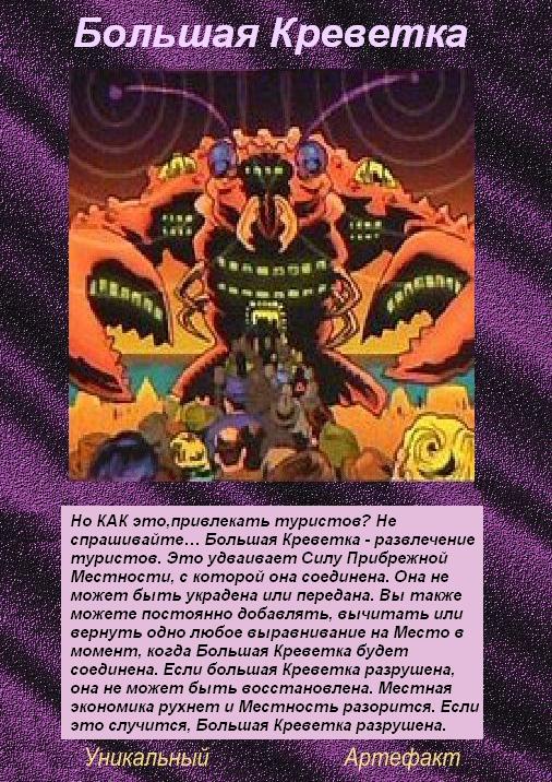 Но КАК это, привлекает туристов? Не спрашивайте... Большая Креветка - развлечение туристов. Это удваивает Силу Прибрежной Местности, с которой она соединена. Она не может быть украдена или передана. Вы также можете постоянно добавлять, вычитать или вернуть одно любое выравнивание на Место в момент, когда Большая Креветка будет соединена. Если Большая Креветка разрушена, она не может быть восстановлена. Местная экономика рухнет и Местность разорится. Если это случится, Креветка разрушена.