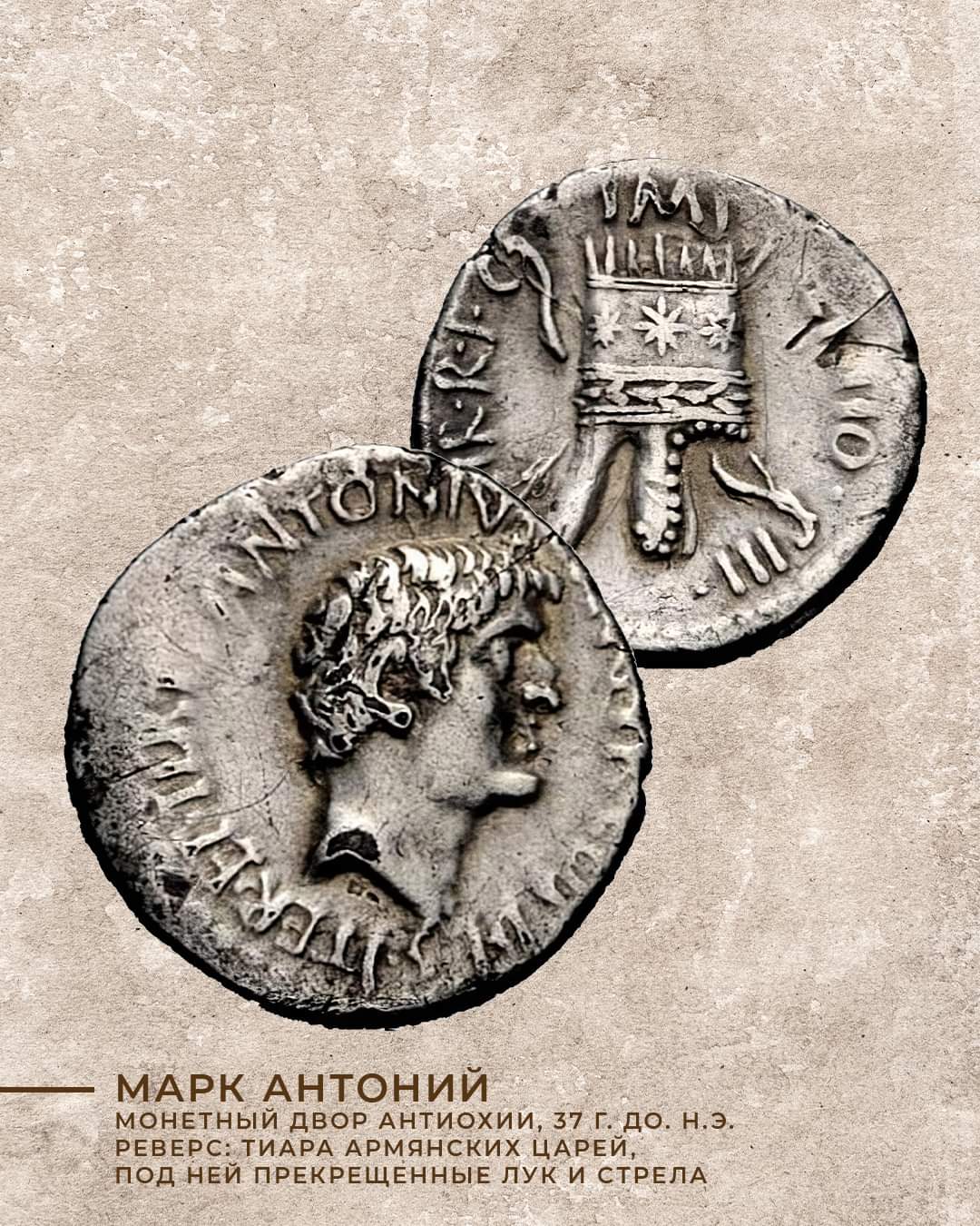 🪙 Римский серебряный динарий Марка Антония, украшенный армянской тиарой, луком и стрелой (37 г. до н.э.).