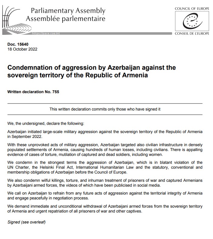 The European Parliament Report: "Strongly condemns the large-scale military aggression by #Azerbaijan in September 2022 against multiple places in the sovereign territory of #Armenia…"