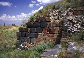 At the southern end of Ani the ground rises up to form a flat-topped hill. This part of Ani is known as the "Inner Fortress" (Midjnaberd in Armenian), or simply as the "citadel". As well as having natural defences of steep cliffs on three sides, the citadel was encircled by a single line of ramparts. This wall had towers on its north facing section, and an entrance gateway at its north-western corner.