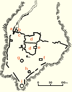 Within the citadel ramparts are the extensive ruins of a palace [d] that occupied the highest part of the citadel hill, the ruins of at least five churches [e, f, g, h, i], and the ruins of several unidentified buildings. Today, there are the visible remains of three churches within the citadel: the "Church of the Palace" [e] , the "Mausoleum of the Child Princes" [f], and the "Hexagonal Church of the Citadel" [i].