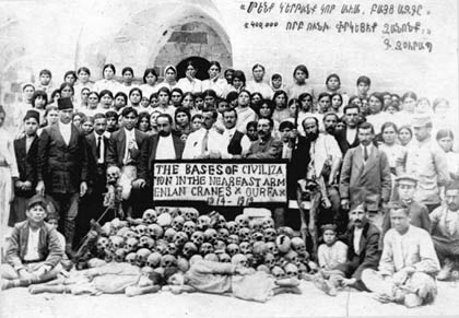 Armenian refugees at the pyramid made from the sculls of Armenian martyrs