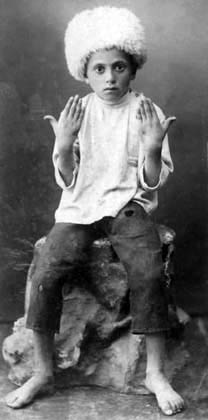 Mousheghik, from the village of Dizi of Van province, showing the holes in his hands after he was crucified, 1915