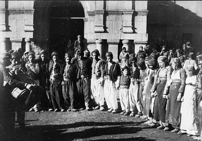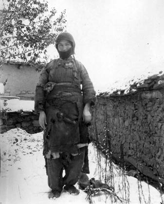 Armenian leader Papasian looking at the human remains of the terrible massacres at Der-el-Zor in 1915-1916.